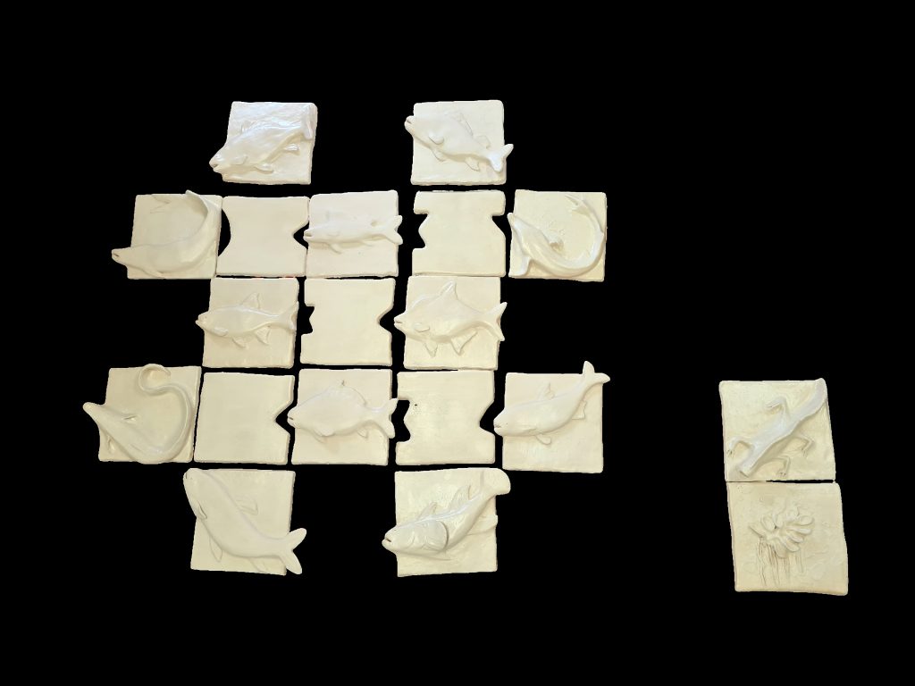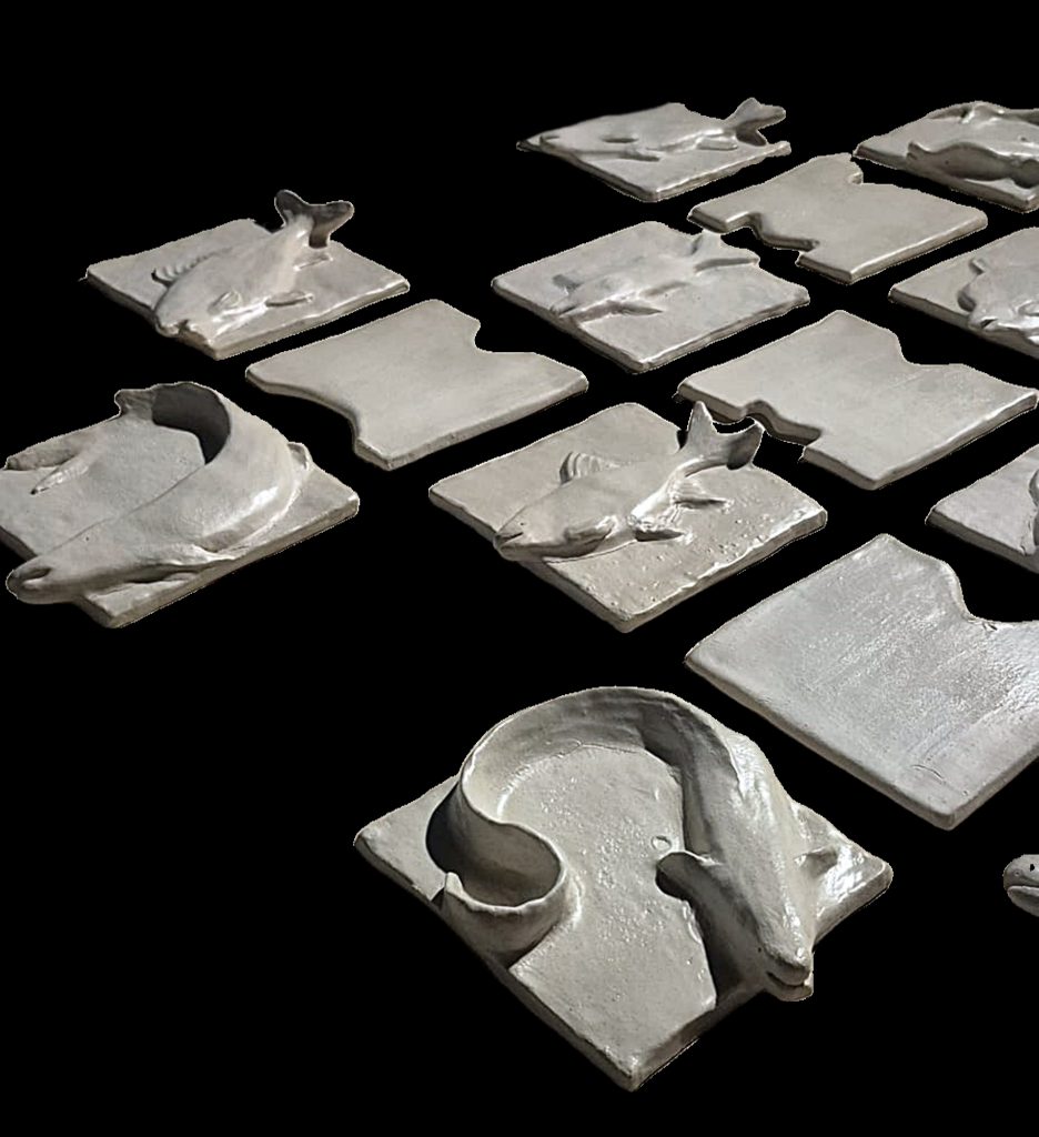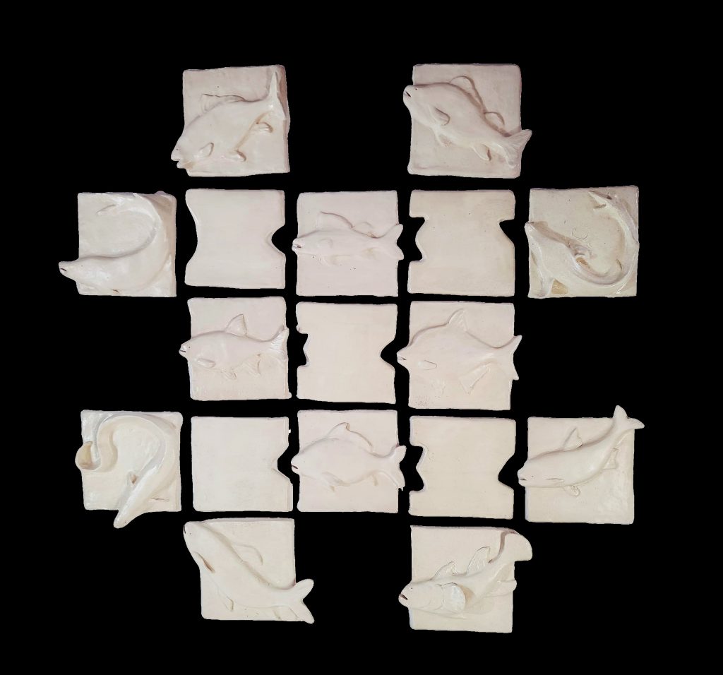 A series of ceramic tiles with high reliefs of fish species affected by the destruction of the reservoir creates a “fragment of the bottom”.